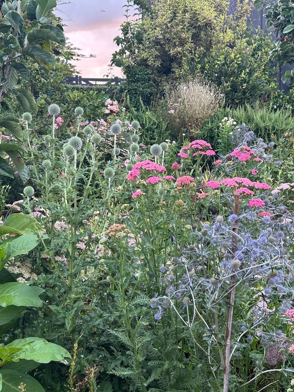 Prairie garden - pastels pink / blue. Achillea, echinops, Eryngium, verbascum