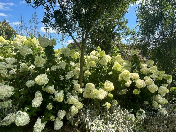 Hydrangea panniculate Limelight. Lomamdra and pittosporum balls . Structure and whimsy garden